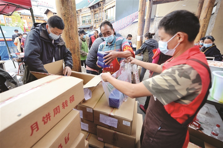 9月10日,在四川省泸定县磨西镇安置点,志愿者为受灾群众和救援人员分发月饼,共度中秋。