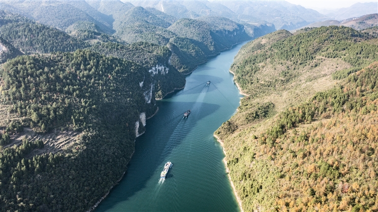 运载磷矿石的货船沿乌江航道顺流航行(2021年11月18日摄,无人机照片) 新华社记者 陶亮 摄