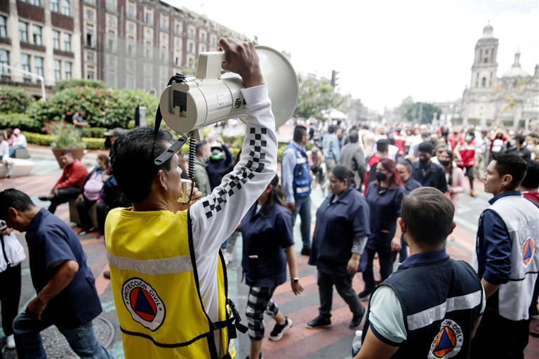 9月19日,在墨西哥首都墨西哥城,民防人员引导室外避险的民众。