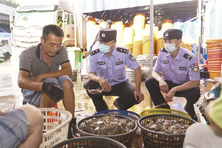 民警和辅警队员在水产市场走访检查,守护群众舌尖上的安全