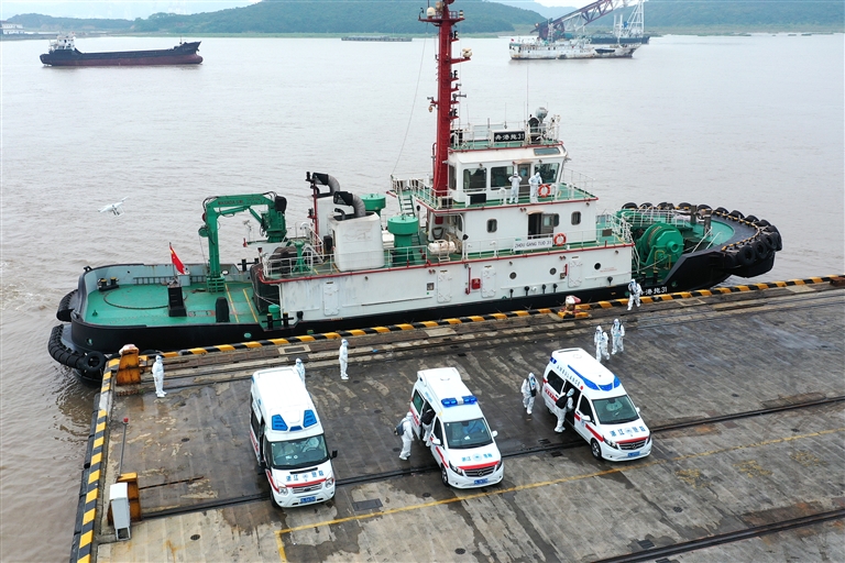 8月9日晚,确认16名船员新冠肺炎病毒核酸检测阳性,首批11名船员被转运至定点医疗机构;8月15日,剩余9名值守船员顺利上岸,至此全船20名船员全部上岸得到救治。