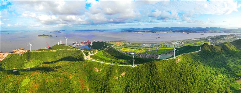 近日,在定海区小沙街道长白岛,舟山华电小沙风力发电有限公司风电场的8架“大风车”在海风吹拂下运转发电,成为该地一道美丽的风景。据了解,今年1~8月该风电场已累计发电超1000万千瓦·时。摄影 记者 陈永建 通讯员 徐沛昕