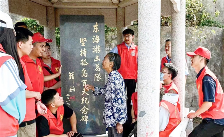 滩浒村80岁老人邬亚娣正在向青年党员讲述东海游击总队坚守孤岛百日战斗英勇事迹。国庆节来临之际,嵊泗县洋山镇组织60余名党员干部来到悬水小岛滩浒,开展主题党日活动。