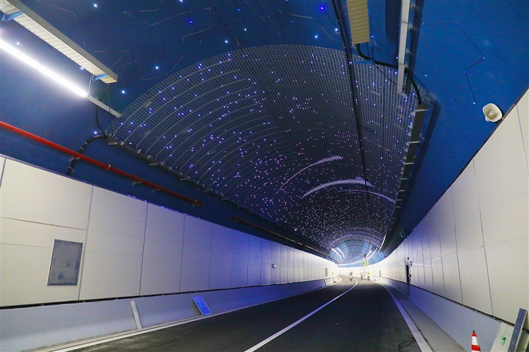 汽车驶入隧道,先是一段缓坡,隧道穹顶上是一片蓝色天空图案。“这一段是山岭隧道,采用的是传统的矿山法建设,简单来说就是爆破开挖,上面这座山是刺棚山。”马政印说。记者从车窗望去,隧道里有不少工作人员,有的在清理垃圾,有的在清洗墙壁。