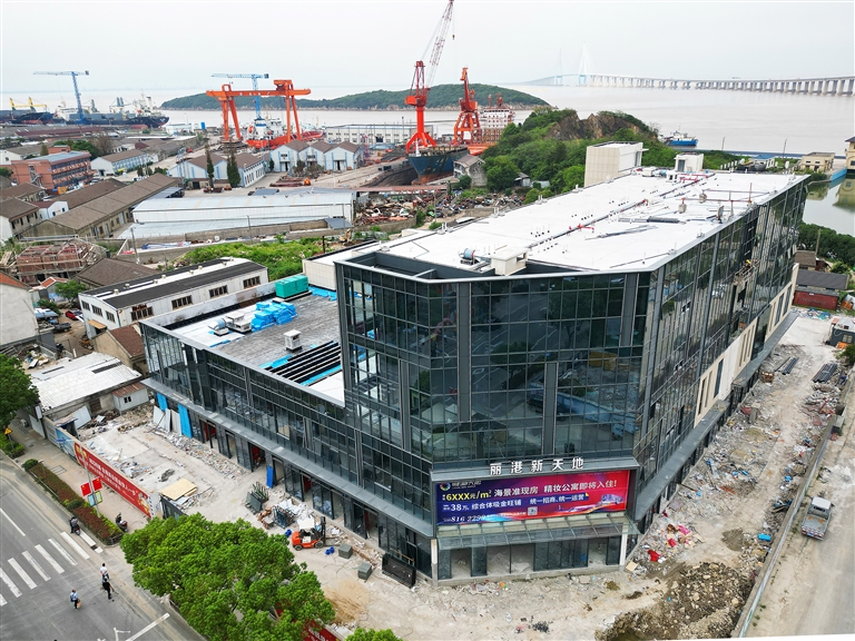 本报讯 近日,金塘首个商业综合体项目“丽港新天地”建设现场,一片繁忙的施工景象。1号地块建筑单体基本完成,正在进行室外附属工程施工;2号地块正在进行外立面施工,预计10月可完成。截至目前,“丽港新天地”项目整体建设进度已达80%,预计明年9月正式开业。
