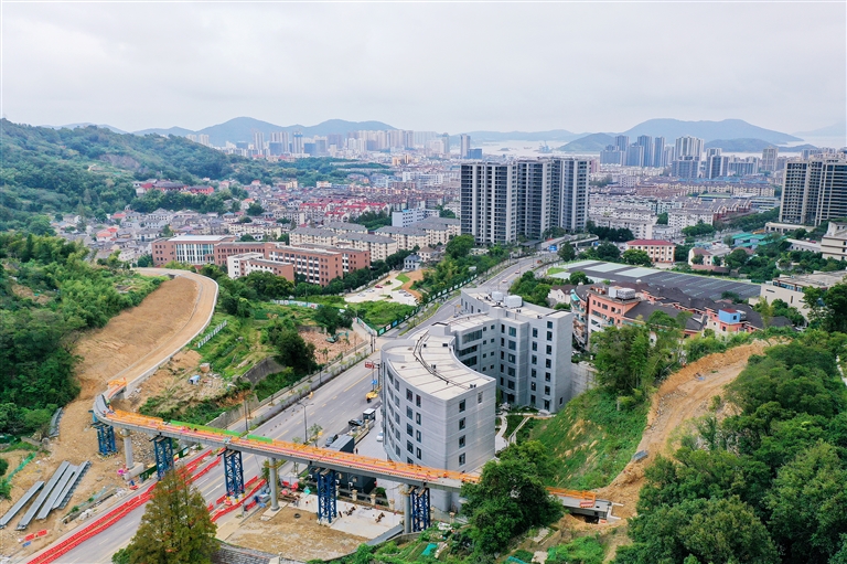 9月29日23时20分,定海东海云廊首条城市飘带顺利合龙。该飘带横跨西山路,全长124米、净高11米,宽4.5米,实现了东海云廊海山段与竹山段的有效串联,这是东海云廊首条完成的城市飘带。摄影 记者 陈炳群