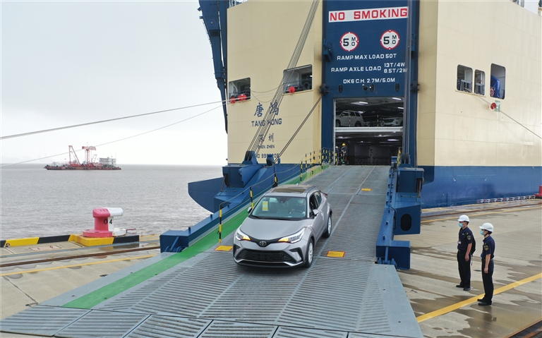 招商局港口(舟山)滚装码头开展汽车卸载作业