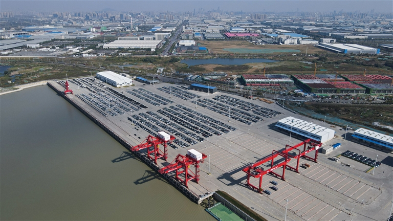 这是10月11日拍摄的安徽合肥派河国际综合物流园港区码头(无人机照片)。近日,安徽合肥派河国际综合物流园港区一期工程通过竣工验收,初步具备了开港条件,这是将于年底试通水通航的江淮运河上第一座集装箱码头。安徽合肥派河国际综合物流园港区一期工程拥有8个2000吨级泊位,设计年吞吐量390万吨。江淮运河是引江济淮工程的重要组成部分,沟通长江、淮河两大水系。 新华社记者 杜宇 摄