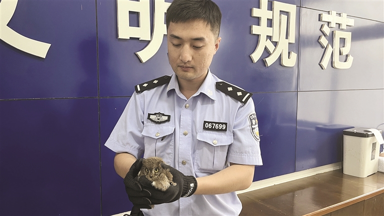 近日,岱山衢山公安分局民警在巡逻中发现一只受伤的野生动物,经查询,系国家二级保护动物猫头鹰。民警及时将其带回派出所初步救助,并联系自然资源和规划局交接。(徐霜霜)