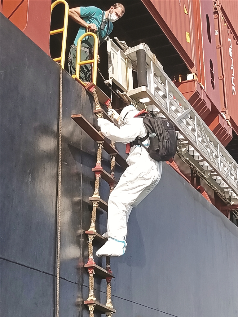 高温天气下,引航员身穿防护服登轮引航