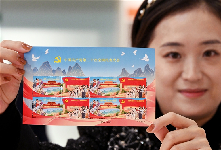 10月16日,中国邮政发行《中国共产党第二十次全国代表大会》纪念邮票一套2枚,小型张1枚。 新华社 发(郝群英 摄)