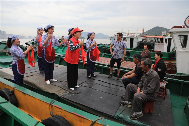 “东海渔嫂“志愿服务团队为渔民表演节目