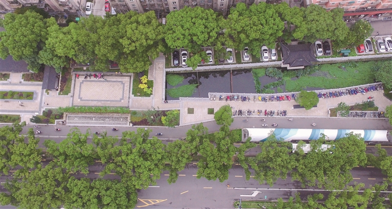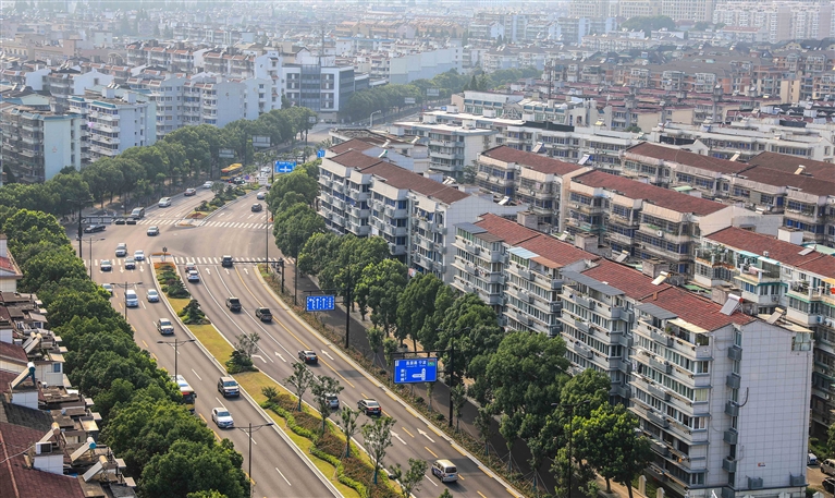 俯瞰定海东门汽车站附近,道路绿树成荫,汽车、电动车停放整齐,市民出行有序,沿河小公园移步换景 摄影 记者 张磊