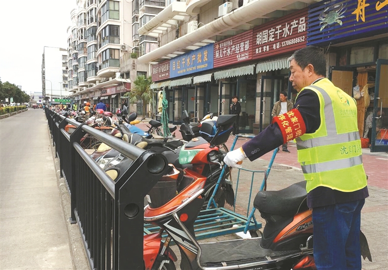 沈家门街道工作人员将非机动车摆放整齐
