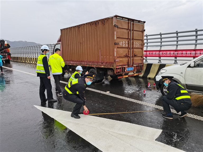 据了解,市高速交警支队、市交通运输执法队等10家单位参与此次联合演练,为完善舟岱跨海大桥应急救援机制积累了经验。