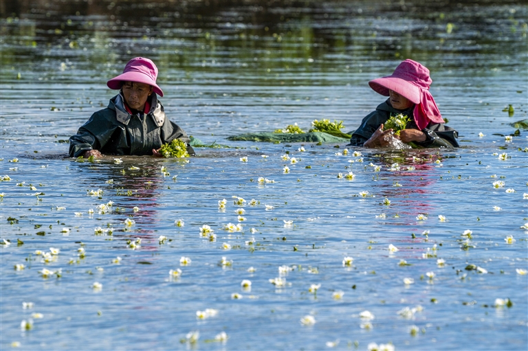 海菜花对生存环境的水质要求高,被视为“水质风向标”。在云南大理洱海,海菜花一度难觅踪迹。如今,随着水质逐渐恢复,海菜花不仅回到了洱海,还成为百姓增加收入的“致富菜”。海菜茎叶可食,甜糯清香的“海菜芋头汤”是大理白族人家的特色美食。经过数年发展,在大理白族自治州洱源县右所镇松曲村,1500多亩海菜田逐渐连片,年产值达1800多万元。 新华社记者 江文耀 摄