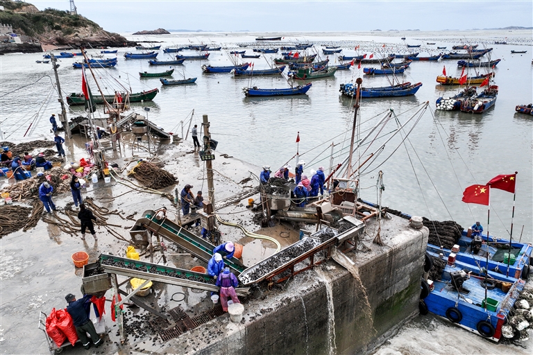 眼下正是养殖贻贝收获加工旺季,连日来,嵊泗县枸杞乡干斜村的渔业码头上,渔民们把刚从洋地上运回来的贻贝进行脱粒加工,装袋。