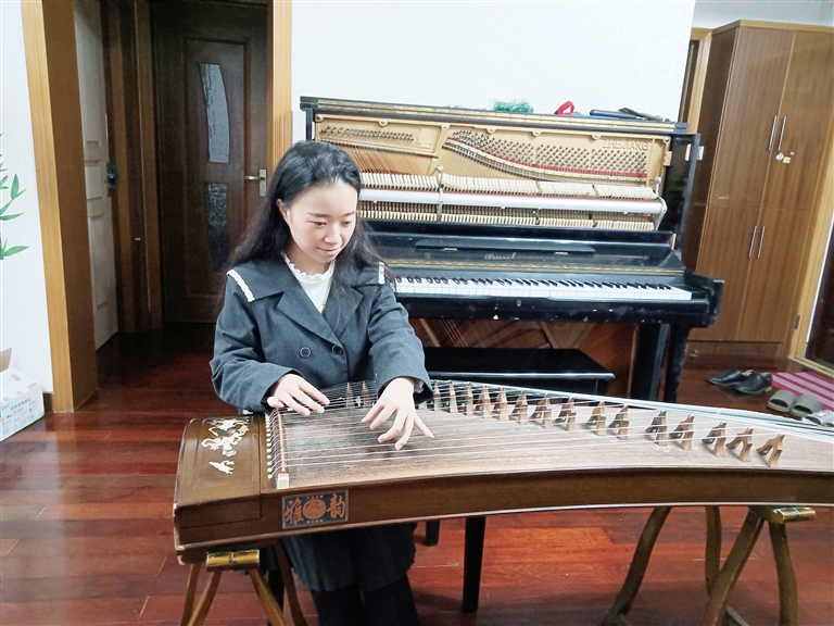 定海新露亭公寓一套住宅内,传出流畅、激昂的古筝弹奏声。一头乌黑的长发,个子娇小的应敏沉浸在音乐中(见图)。