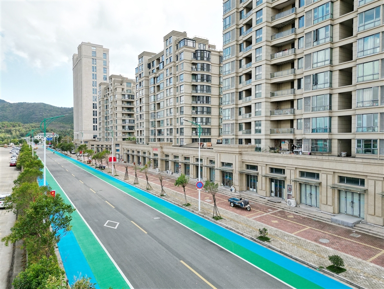 本报讯 骑行在蓝绿相间的马路上,美丽的风景从眼前掠过。近日,一条蓝绿相间的道路出现在金塘里小岙至和建公路的非机动车道上(见图)。这条长2公里的道路采用WPT水性环保改色工艺施工,为金塘增添了一抹亮丽色彩。