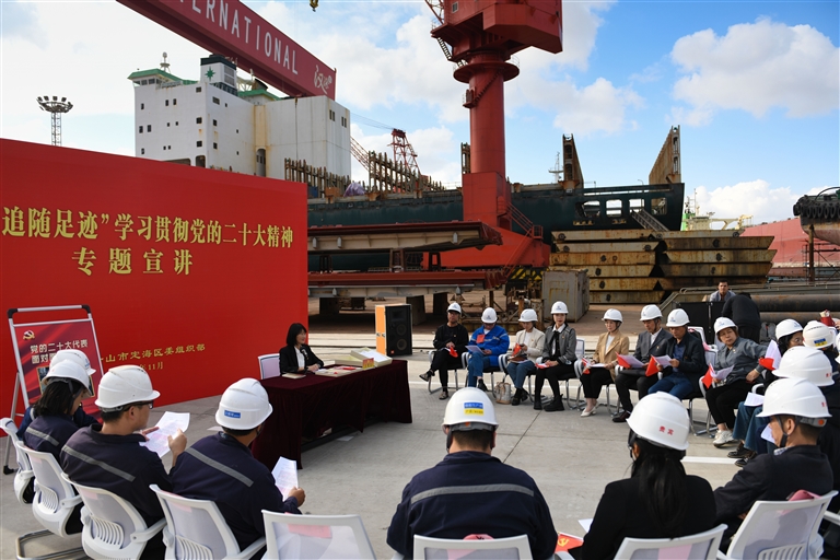 昨天下午,舟山长宏国际船舶修造有限公司30万吨船坞旁,一块红色的“党的二十大代表面对面”展牌竖在空地上,现场气氛热烈。
