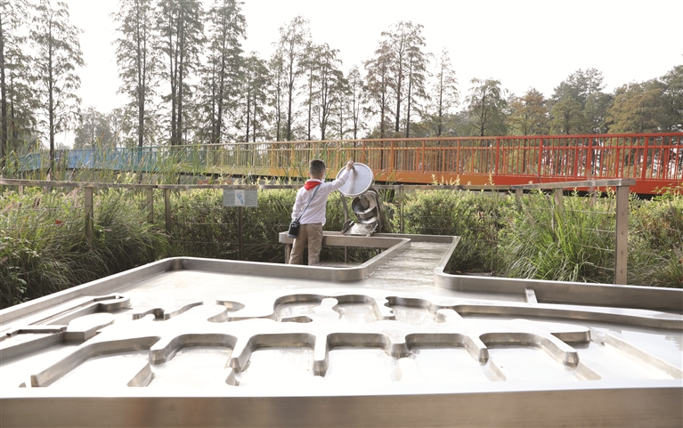 11月5日,小朋友在武汉华侨城生态湿地公园体验演示水净化原理的“阿基米德取水器”。