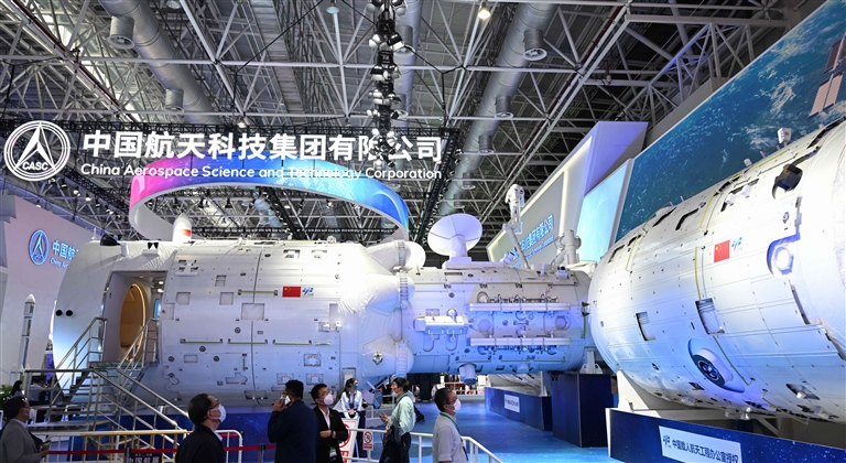 观众在第十四届中国航展参观中国空间站组合体展示舱(11月8日摄)。11月8日至13日,第十四届中国国际航空航天博览会(中国航展)在珠海举行。展会中,按真实比例1∶1制作而成的中国空间站组合体展示舱成为展会上的观众打卡点。据了解,中国空间站以天和核心舱、问天实验舱、梦天实验舱三舱为基本构型,天和核心舱、问天实验舱、梦天实验舱呈“T”字基本构型结构分布。 新华社记者 邓华 摄