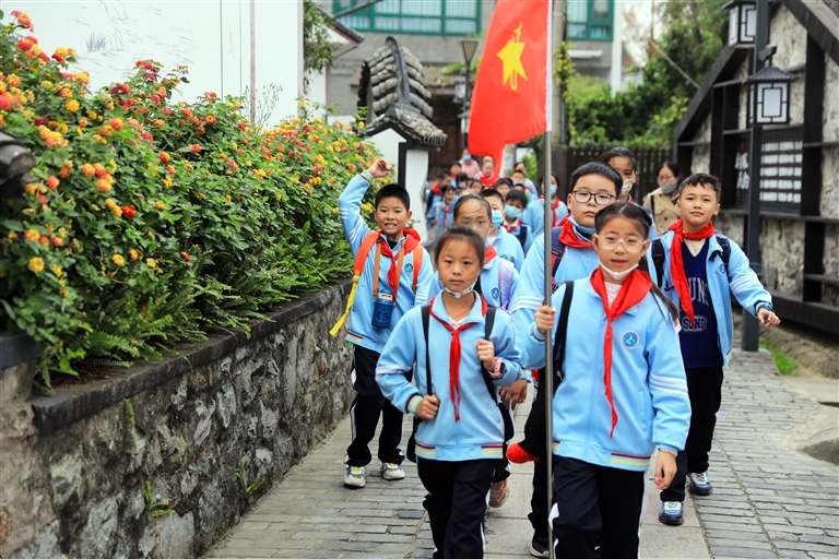 近日,在岱山县岱东镇涂口村上船跳,游客络绎不绝。近年来,当地大力改善旅游环境,“精致村落”初见成效,吸引众多游客来此乡村游。图为来自高亭中心小学的200名学生正在上船跳开展秋季研学活动。摄影 记者 陈永建