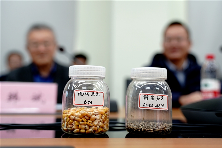 11月16日在中国科学院分子植物科学卓越创新中心拍摄的野生玉米种子和现代玉米种子。 新华社记者 张建松 摄