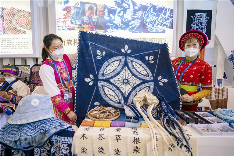 11月20日,扎染技艺传承人在南博会旅游文化馆内展示扎染作品。