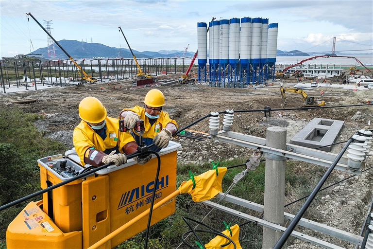 当天,技术人员在金塘岛开展了五处带电作业施工,在不影响岛内企业用电的情况下,开展搭火保电施工,为下阶段甬舟铁路建设提供坚实的用能保障。