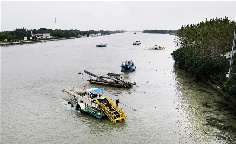 苏浙沪三地的保洁船在太浦河水域联合清理水面浮游植物(2020年10月15日摄,无人机照片)。当日,来自苏州市吴江区、上海市青浦区和嘉兴市嘉善县的三名河长在位于长三角生态绿色一体化发展示范区的苏浙沪交界水域太浦河流域附近开展联合巡河活动。 新华社记者 方喆 摄