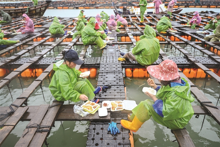 11月25日,在福州连江县苔菉镇后湾海域,渔民在渔排上吃午饭。