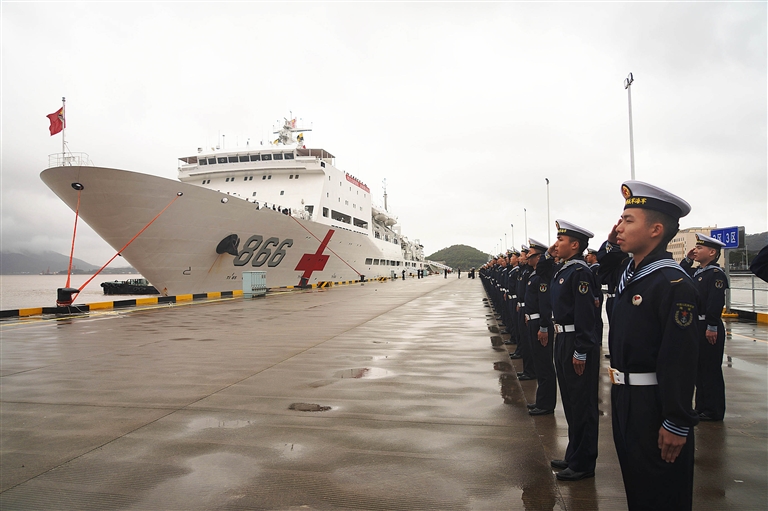 昨天,执行“和谐使命-2022”任务的中国海军“和平方舟”号医院船返回浙江舟山某军港,任务部队官兵代表在码头迎接。新华社记者 孙飞 摄