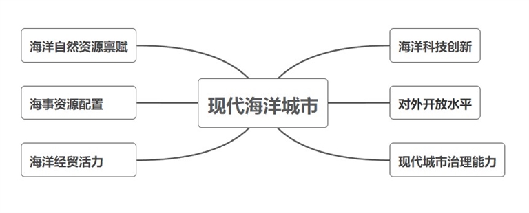 综上,本文将现代海洋城市界定为具有一定的创新与服务功能和国际影响力,产业体系现代化程度较高,在海洋产业链、供应链中起支点作用的综合型沿海城市,具有海洋自然资源禀赋丰富、海事资源配置完备、经贸产业活力充沛、海洋科技创新高效、对外开放水平高、现代城市治理能力强的特点。