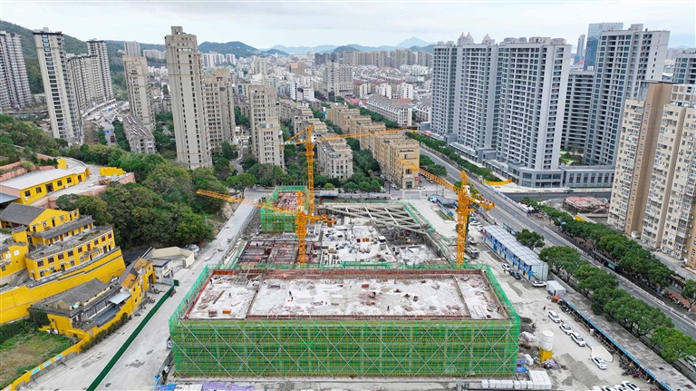 近日,在沈家门天吴隧道南口附近,普陀养老公寓建设工程正在加快施工。据了解,该工程总投资约2.22亿元,总建筑面积4万余平方米。项目建设包括100套养老公寓、112套公共租赁住房、96套人才公寓,配套建设农贸市场等,全方位满足日常生活所需。摄影 记者 陈永建