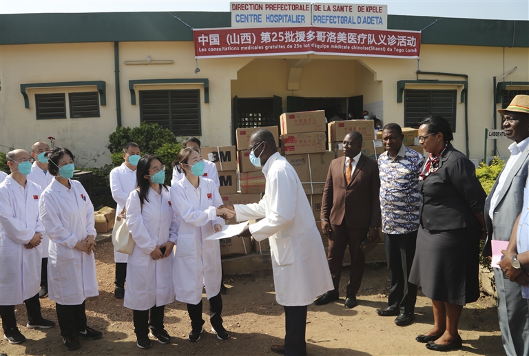 11月30日,中国第25批援多哥医疗队向多哥佩莱省阿代塔镇卫生所捐赠医疗物资。