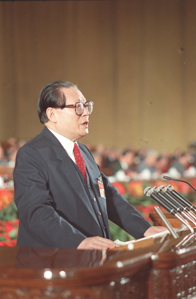 左图:1992年10月12日,中国共产党第十四次全国代表大会在北京人民大会堂开幕。这是江泽民同志代表第十三届中央委员会作报告。