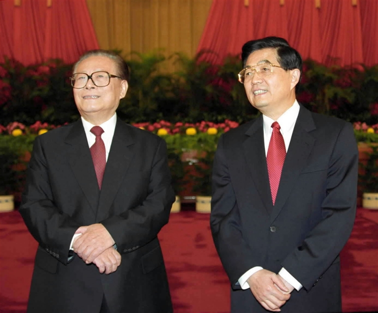 左图:2002年11月15日,江泽民同志、胡锦涛同志在北京人民大会堂亲切会见出席党的十六大代表、特邀代表和列席人员并发表重要讲话。