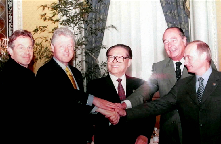 左图:2000年9月7日,由中国倡议的联合国安理会五个常任理事国首脑会议在纽约举行。江泽民同志(中)同法国总统希拉克(右二)、俄罗斯总统普京(右一)、英国首相布莱尔(左一)、美国总统克林顿(左二)握手合影。