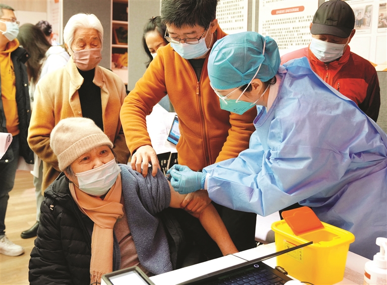 12月9日,接种小分队的护士在大同居委会为老年人接种新冠疫苗。