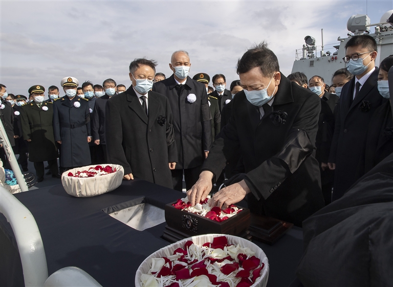 12月11日,遵照江泽民同志及其亲属的意愿,敬爱的江泽民同志的骨灰在长江入海口撒入大海。受党中央委托,中共中央政治局常委、中央书记处书记蔡奇等领导同志和江泽民同志的夫人王冶坪等亲属护送骨灰撒放。新华社记者 李涛 摄