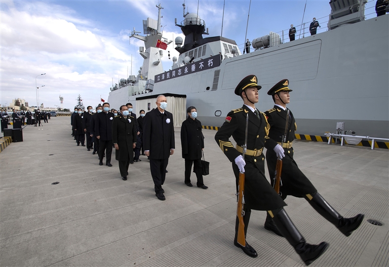 中国人民解放军海军扬州舰伏波静卧,舰上官兵分区列队、肃立舷边。扬州是江泽民同志的故乡。今天,这艘以扬州命名的军舰,以最高礼仪送别这位为党和人民建立了不朽功勋的卓越领导人。江泽民同志的亲属捧护着骨灰登上扬州舰。海军笛吹响,仪仗队持枪肃立,行注目礼。当扬州舰起航时,军港内所有舰船汽笛长鸣,响彻云霄。