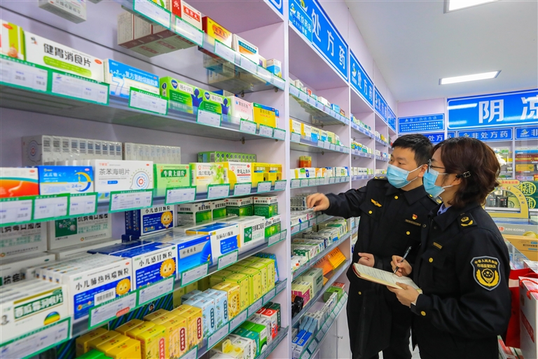 昨天,市市场监管局定海分局工作人员在辖区内抽查零售药店的防疫药品。据介绍,防疫政策优化调整后,工作人员及时跟进,做好零售药店退热、止咳药品和新冠病毒抗原检测试剂等相关防疫物资药品监督检查,并提醒药店合法合规经营。