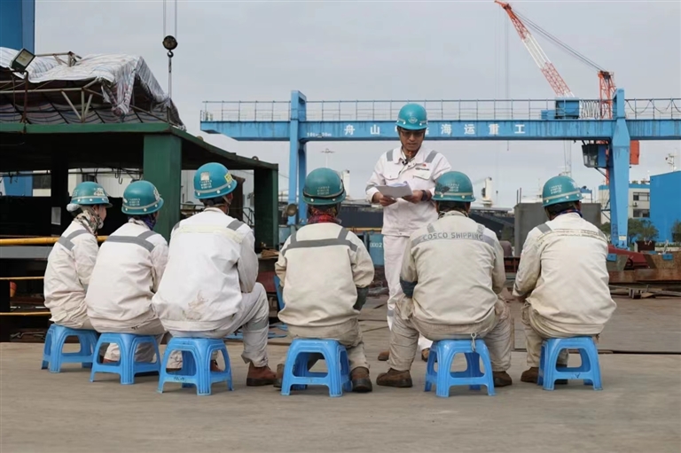 在舟山中远海运重工船体工区门口,几把小板凳摆放中间,五六名职工围坐在一起,全国五一劳动奖章获得者、船体工区协力队班组长刘文富正向班组成员宣讲党的二十大精神。“当前我们生产任务重,很少有机会去了解这些政策精神。现在利用工作间隙学习了党的二十大精神,更激发了我们的工作热情。”班组成员庞侠说。