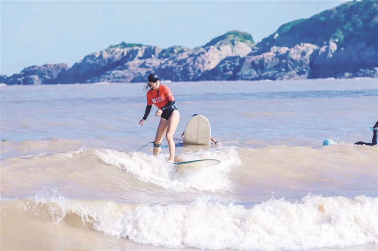 现在,冲浪俱乐部成了朱家尖东沙海滩的一个亮点项目。有人冲浪的场景吸引海滩上很多游客驻足观看,其中不少年轻人跃跃欲试,想要加入。到了初秋,虽然海水微凉,仍有不少游客穿着鲨鱼保暖衣在东沙冲浪。这些热爱户外运动的年轻人聚集到舟山,不仅能带动冲浪项目在舟山的发展,而且让这里的民宿、酒吧、餐饮都能分到一杯羹。