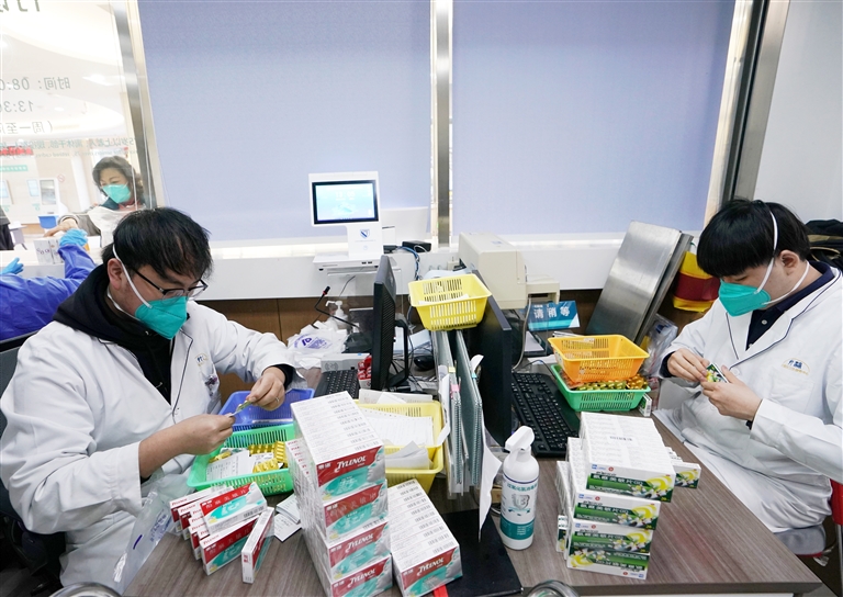 12月20日,在黄浦区打浦桥街道社区卫生服务中心药房,药师们将解热镇痛药品进行拆盒分装。
