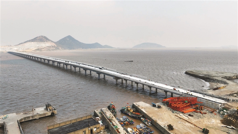 12月22日,施工人员正抓紧对普陀区展茅街道螺门后门山至梁横山桥梁工程进行施工,目前,该桥梁已实现贯通,建设进度完成总工程量的90%。据了解,后门山至梁横山桥梁总投资15789万元,桥梁全长1090米,计划在明年四月底完工。