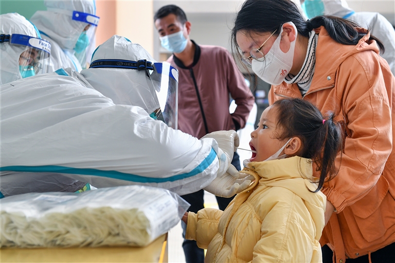 一名可爱的小朋友在妈妈的陪同下很配合地进行核酸检测采样