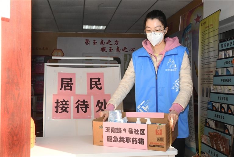 12月27日,在北京市海淀区羊坊店街道玉南路9号社区居委会,工作人员将“共享药箱”放置在门口。