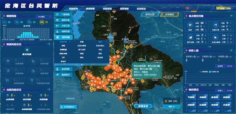 在“台风智防”应用平台上,定海各风险区域、内涝点水深实时监测数据一屏掌握。“梅花”来袭期间,平台结合气象降雨预报等数据,监测到定海城区29个易涝点水深达10~55cm,第一时间通知属地进行现场抽排,响应速度较以往至少提前20分钟。